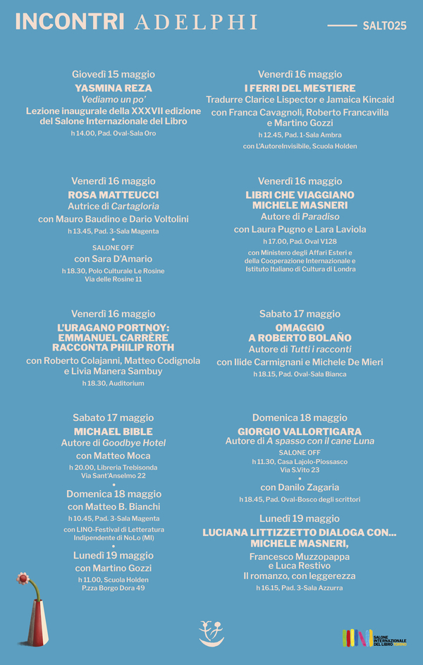 Il clou della presenza delle edizioni Adelphi al Salone di Torino sarà la prima presentazione italiana della nuova pubblicazione integrale delle opere di Philip Roth: in particolare, sarà presentata la nuova edizione di Portnoy (Fabula, 421), libro che definitivamente consolidò la fama dell’autore americano.