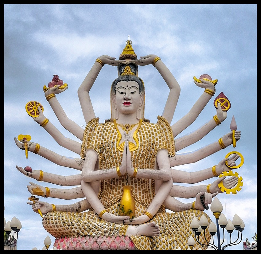 Momento cultura con visita ai due principali templi, quelli più vicini: il Big Budda con la sua ruota della vita, dodici metri dorati che fanno la loro bella figura quando riflettono la luce del tramonto, e Wat Plai Laem, questo davvero dietro casa, un colorato complesso costruito solo nel 2004 su una serie di isolette sopra un alquanto stagnante lago artificiale, abitato da una miriade di famelici pesci gatto, ingrassati dai fedeli. Erano abbastanza disgustosi. I pesci, intendo. Ciò nonostante lo preferisco, perché dedicato a Guanyin, dea cinese della compassione, fonte di amore incondizionato, protettrice degli esseri umani, nonché dea della fertilità. Tanta roba.
