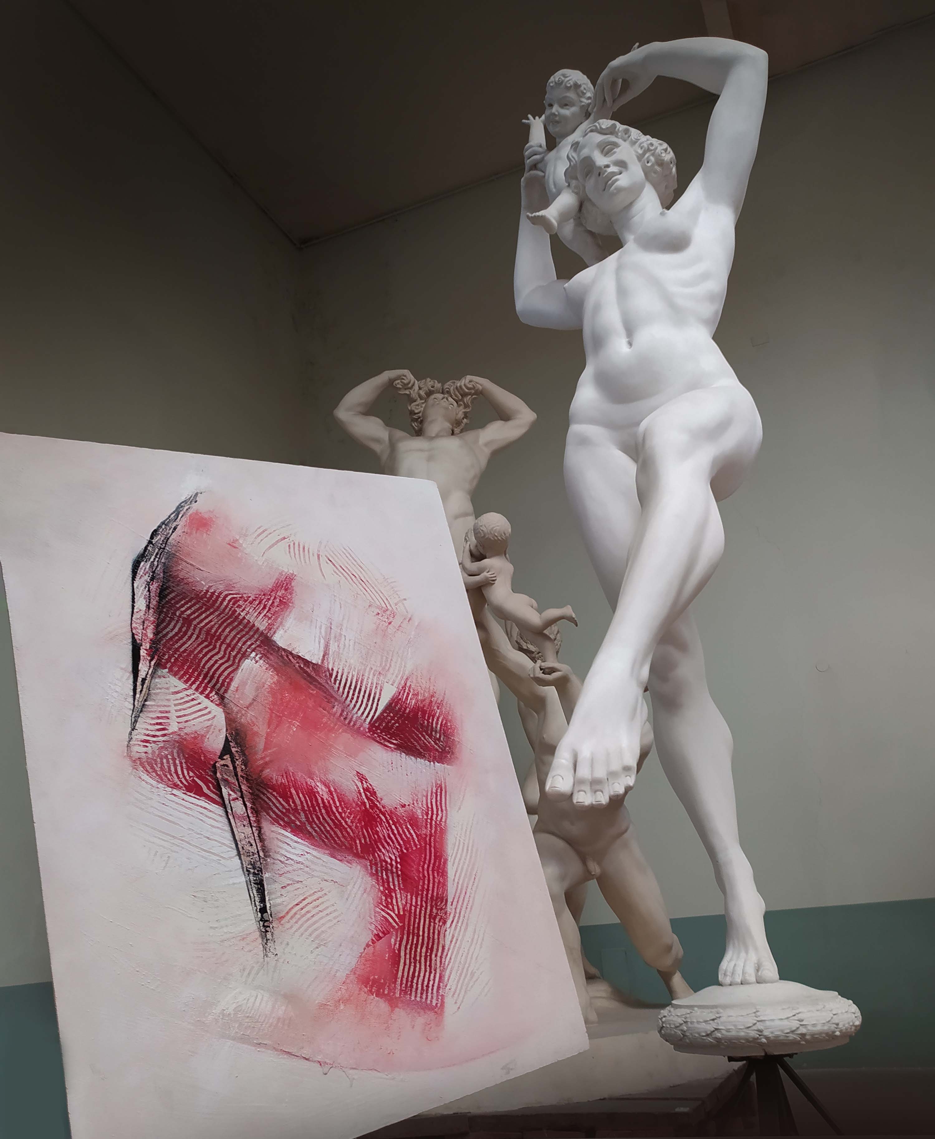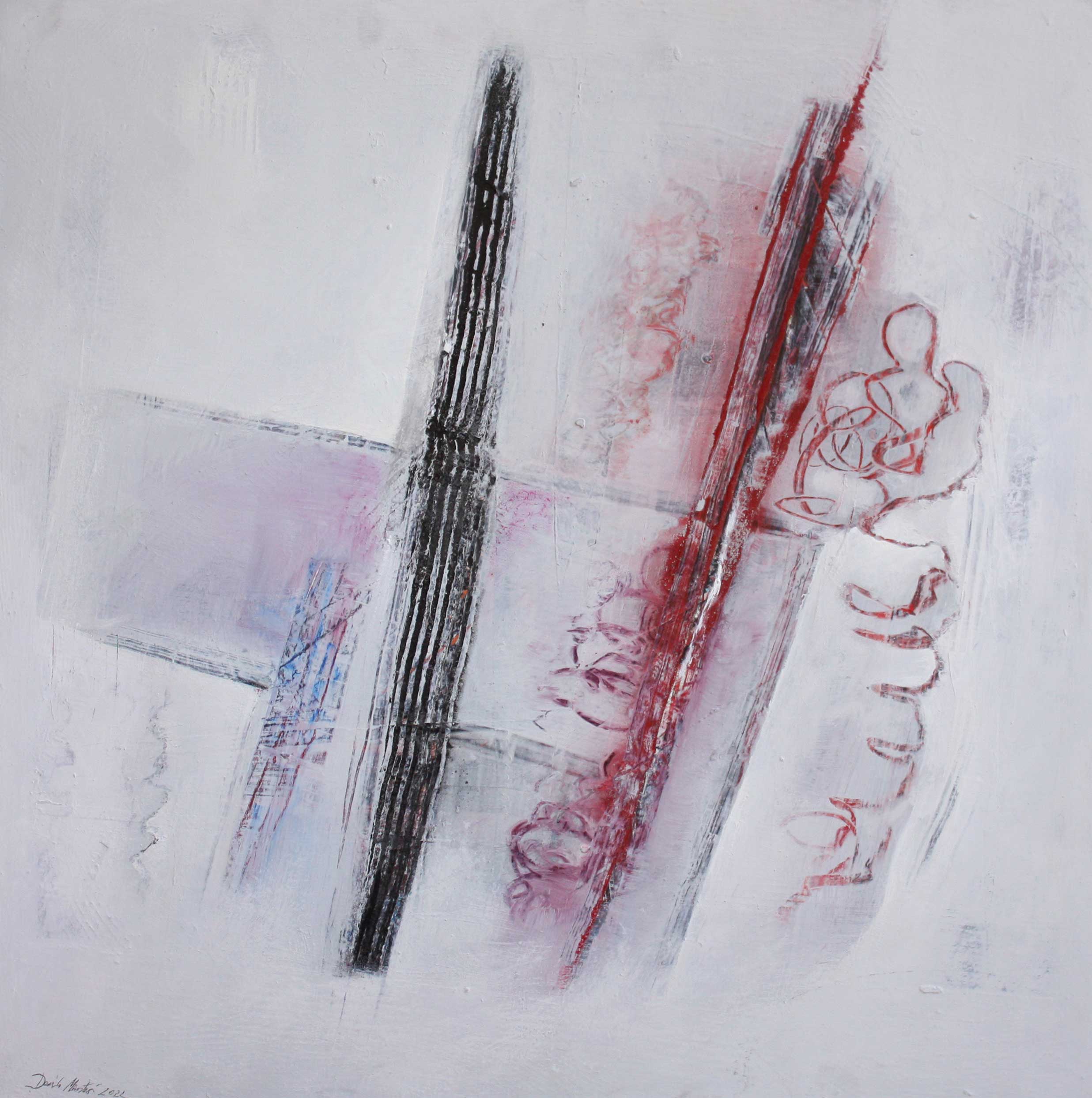 A che cosa serve l’ossessione di Penelope? È risolutiva questa sottomissione al dominio del tempo? Non sarebbe più utile, al contrario, un atto di rivolta violenta come quello di Medea? Oppure non sarebbe, invece, più saggio affidarsi totalmente al Caso, come Arianna, che aspetta dal Caso l’occasione giusta per la sua vendetta? Nelle tele di Danilo Maestosi c’è proprio questa sequenza di domande: la vita è seguire la propria volontà o affidarsi al proprio destino? È meglio essere se stessi o non esserlo? Penelope è una delle prime figure mitiche a porsi questo interrogativo. E, se cercate la risposta, la troverete nelle opere di Danilo Maestosi: la soluzione è essere pronti. Vigili e presenti, accompagnando il Caso con le proprie emozioni che si fanno gesto pittorico. Questo senso hanno le figurazioni “umane” che, di quanto in quando, compaiono qui nei suoi dipinti: sono i contorni di Penelope che osserva, che si adatta al proprio Destino, prende le misure e vive dentro di esso, riversando nella sua tela le rabbie e il coraggio di cui s’è detto.
