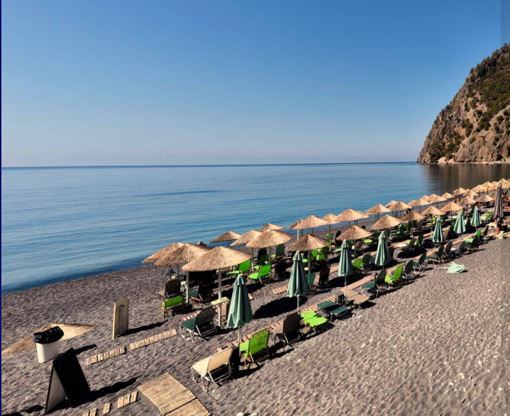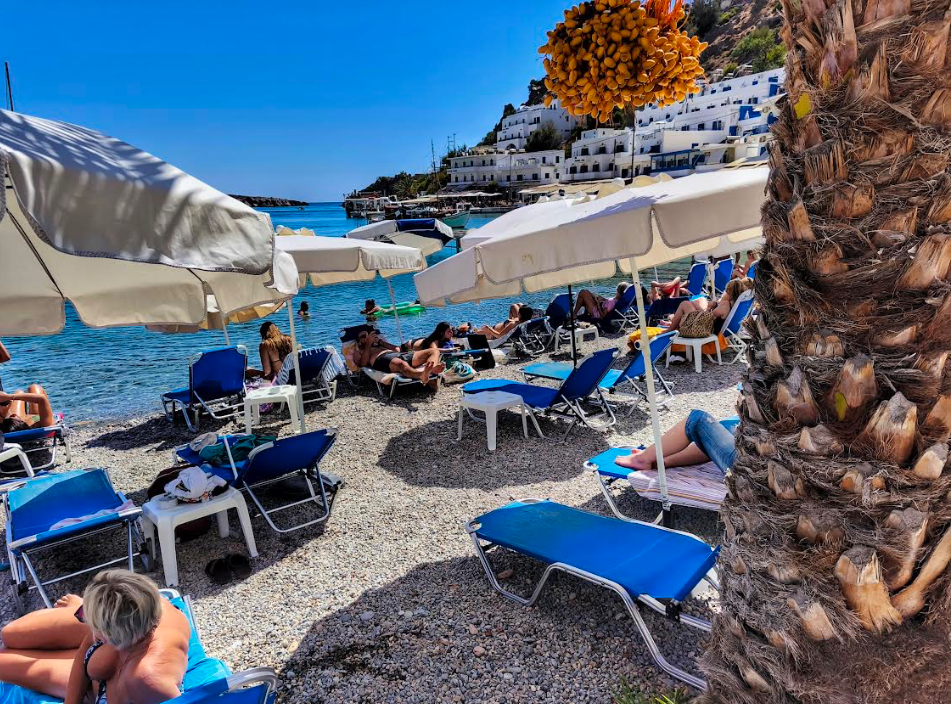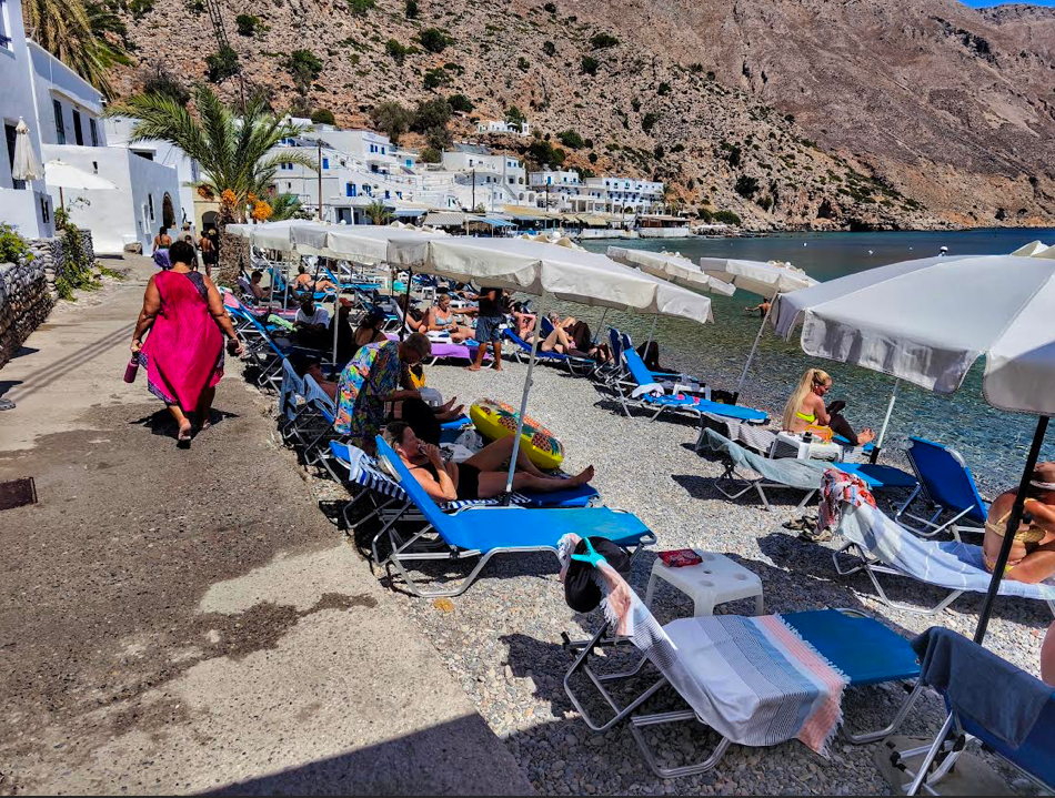 Si parte alle 8,30, per noi un'alzataccia. per arrivare in una quarantina di minuti, a Loutro, che si pronuncia accentato sulla o; un posticino di charme impeccabilmente dipinto di bianco e di un blu oltremare identico in ogni dettaglio, che presuppone un RAL comunale, tanto è perfetto. Un’insenatura a mezzaluna di bianche casette che si scopre essere inevitabilmente alberghi, con baretti accoglienti che offrono spritz e mojito e, sospetto perché sono maligna, piccole tapas piuttosto che mezès. Loutro a fatica si è ritagliato una doppia fila di ombrelloni vergognosamente corpo a corpo, per dire quanto sono vicini. L'acqua color smeraldo brilla come un gioiello, ma è pur sempre un porto, per cui noi l'agognato bagnetto non lo abbiamo fatto, rimpiangendo le acque limpide e pure e solitarie di Agia Roumeli.