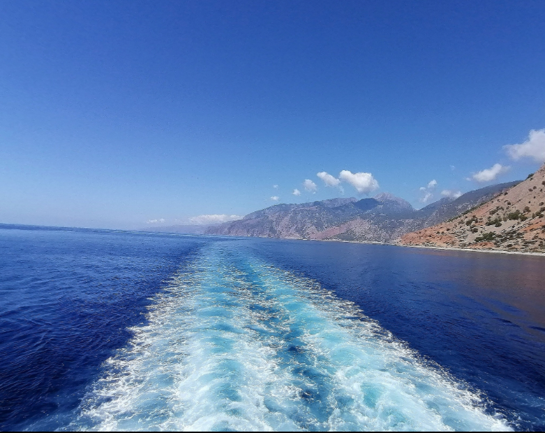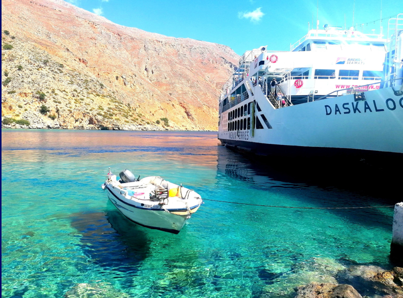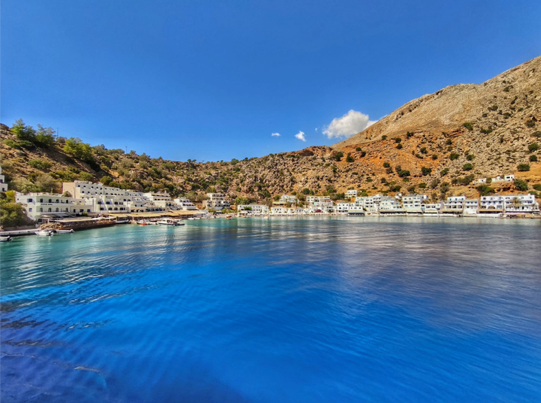 Ce lo siamo goduto sorseggiando un ouzo con vista, dalla tranquilla terrazza che offriva un ottimo toast e poco altro, ma che la sera vantava i cocktail della tradizione. Avremmo voluto fare di più ma c'era poco da fare se non guardare il via vai di barchette di ritorno dalle escursioni. In lontananza, dietro un promontorio, le bianche case di Hora Sfakion, anche detta Sfakia, da dove si arriva anche da Chania, attraverso una strada di 17 o 19 tornanti, dovrei controllare, dalle curve a gomito a strapiombo sul mare libico, davanti alle quali quelle famigerate dello Stelvio impallidiscono. Ma è tutta scena, la percorrono in tranquillità gli autobus della KTEL; potremmo, forse, farcela anche noi, pavidi anziani.