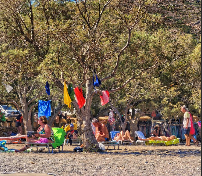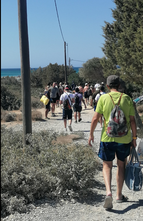 Per raggiungerla, usciti da Paleochora, prepararsi a un paio di chilometri di sassosa e tortuosa strada sterrata lungo il mare, che già ti fa sentire tagliato per l'avventura. Tragitto condiviso con energetici camminatori di tutte le età, equipaggiati di tutto punto: fondamentale scorta di acqua, scarponcini e cappellini, zainetti e bastoncini, diretti, come avrei scoperto dopo aver visto il cartello, non a farsi un bagnetto, ma ad inoltrarsi con passo deciso, sul sentiero E4 che porta, dio li benedica e gli dia la forza, a Sougia, distante - e qui Chatgpt mi ha rifilato una delle sue approssimate panzane - 14,5/16 km, subito smentita dal bagnino, che li ha ridimensionati a 6km, perciò più fattibili, ma che in realtà sono 9,5km in base all’affidabile cartello che anticipa il percorso.