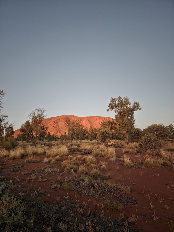 Questa suggestione l’ho ritrovata osservando l’Uluru, che non è una “montagna” nel senso classico — alta solo 348 metri e con una circonferenza di oltre 9 chilometri — ma ciò che resta visibile di una formazione geologica antichissima: la maggior parte della sua massa prosegue nel sottosuolo. I suoi colori cambiano durante il giorno - dal viola al rosso acceso- soprattutto all’alba e al tramonto.