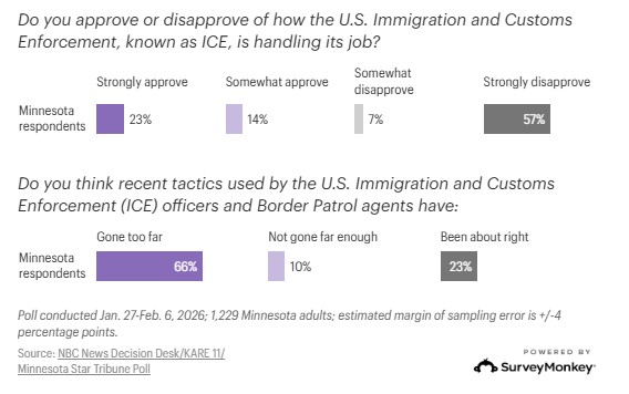Gli abitanti delle Twin Cities (Minneapolis-St Paul) e dei sobborghi condannano quasi all’unanimità l’azione repressiva dell’Ice e di Trump: in un sondaggio NBC/KARE 11/Minnesota Star Tribune, i due terzi degli intervistati giudica “eccessive” le tattiche della polizia federale anti-immigrazione, percentuale che sale all’82% nelle due metropoli. Nei principali sobborghi - Anoka, Carver, Dakota, Hennepin, Ramsey, Scott e Washington counties – il tasso di contestazione scende al 71%, resta comunque altissimo.
