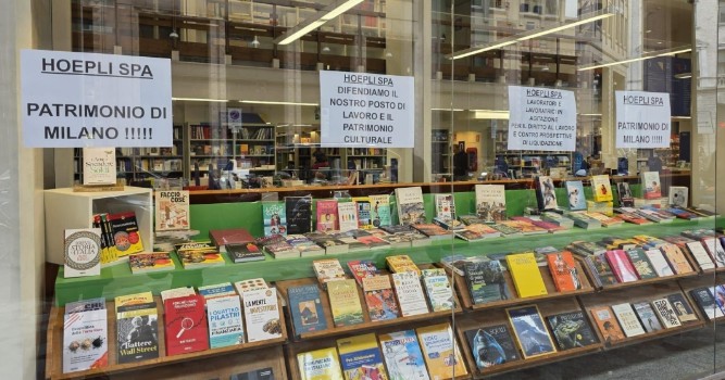 Il primo indizio è venuto da quella lettera spenta, la “O” di Hoepli. All’inizio non ci ha fatto caso nessuno. Ma con il passare dei giorni il neon della grande insegna luminosa non è mai stato riparato. Strano, per una delle più prestigiose librerie e case editrici della città. Quasi incomprensibile per quel tempio della cultura dal 1870 radicato nel cuore di Milano. L’apparente trascuratezza pareva sintomo di qualcosa di grave, inatteso. E infatti. Di punto in bianco sono apparsi, incollati alle vetrine, cartelli espliciti, che documentavano lo scioglimento della società e la messa in liquidazione della società. “Lavoratori e lavoratrici in agitazione per il diritto al lavoro e contro le prospettive di liquidazione”, si leggeva in un cartello. “89 dipendenti e danni collaterali di una guerra tra ricchi”, tagliava corto un altro. “Hoepli SpA Patrimonio di Milano”, rivendicava un terzo. Subito in città è partito un passaparola che in pochi giorni ha raccolto più di quarantamila firme contro la chiusura. Anche il sindaco si è fatto sentire, mentre veniva organizzato un flash mob che sabato mattina ha visto dipendenti e clienti scendere in piazza uniti nella protesta. Perfino il professor Massimo Nunzio Barrella, preside del liceo classico Parini, giovedì 12 marzo ha “occupato” simbolicamente per tre ore la libreria, mostrando cartelli e slogan come “la cultura non si liquida”.