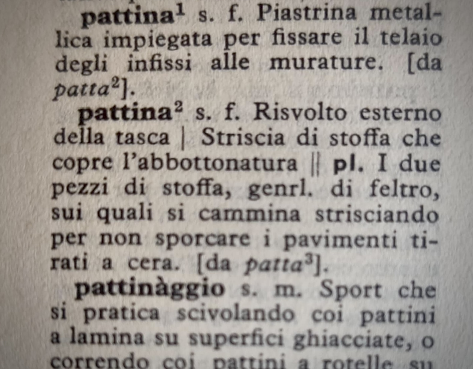 Pattine: “pl. I due pezzi di stoffa, generalmente di feltro, sui quali si cammina strisciando per non sporcare i pavimenti tirati a cera.” Questa è la definizione del Devoto-Oli, il dizionario di lingua italiana, edizione 1980, che posseggo ancora.