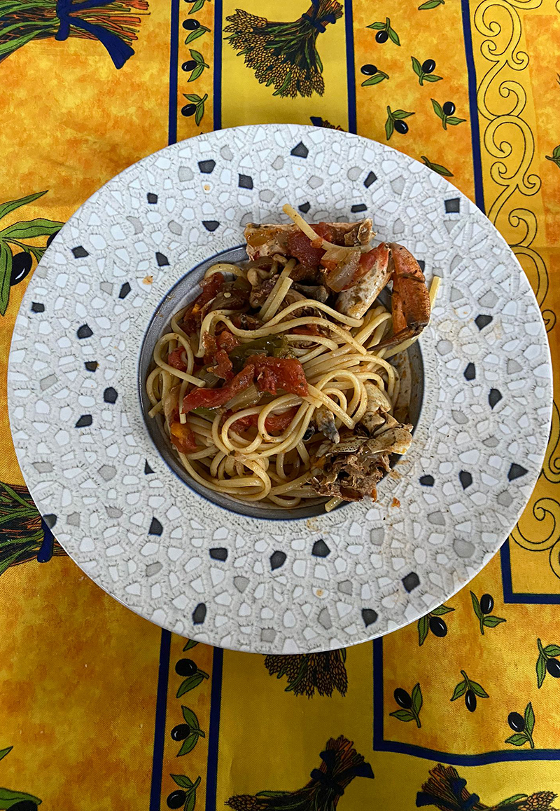 Nel frattempo portate ad ebollizione abbondante acqua e buttate le linguine. Quando la pasta è al dente scolatela e versatela, con un po’ di acqua di cottura nella pentola dove cuoce il granchio.