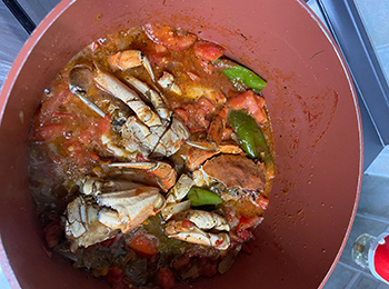 Aggiungete tre peperoni friggitielli dolci e lasciate cuocere per cinque minuti. Tagliate in quattro pezzi il granchio e fate a dadini tre pomodori maturi. Mettete