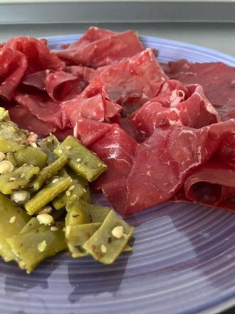 Sulla bresaola va spruzzata qualche goccia di limone, qualche goccia di olio e un po’ di pepe dello szechuan pestato.