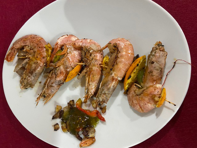 Dopo aver ben lavato e sciacquato i gamberi fissate con uno stecchino le fette di guanciale e il peperone su un lato