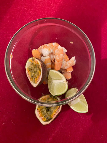 Aggiungete il composto di gamberi e passion fruit e potete servire.