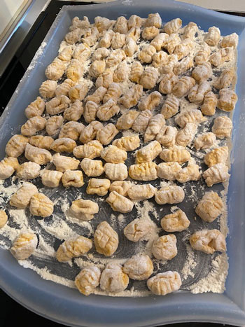 Preparate dei grossi rotoli di pasta spessi un dito e preparate gli gnocchi, rigandoli con i rebbi di una forchetta.