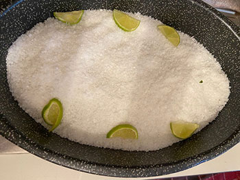 Adagiate l’ombrina sul sale nella teglia, coprite con alcune foglie di trevisana e guarnite con fette di lime.