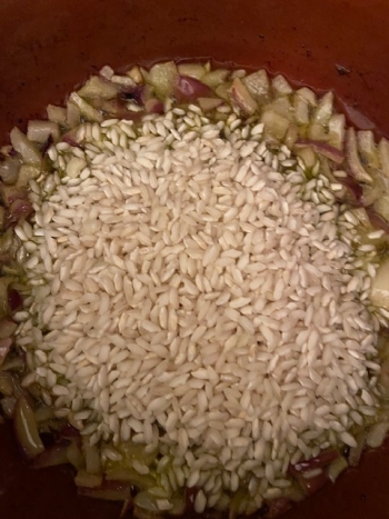 Quando la cipolla è appassita versate il riso nella pentola dopo averlo sciacquato.