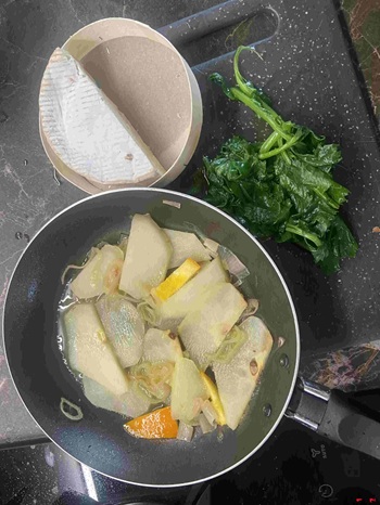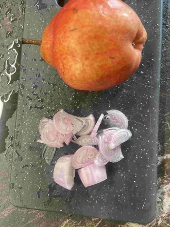 - Aggiungete al soffritto dopo averlo imbiondito le fette di una pera e mezza