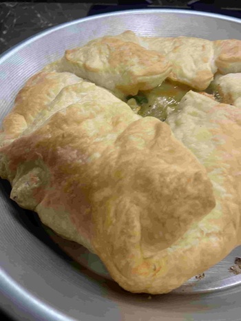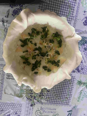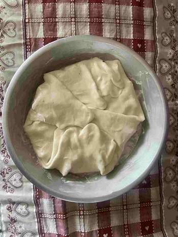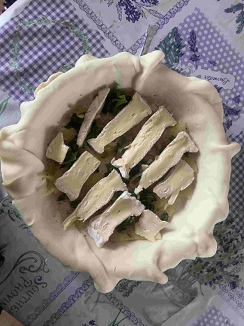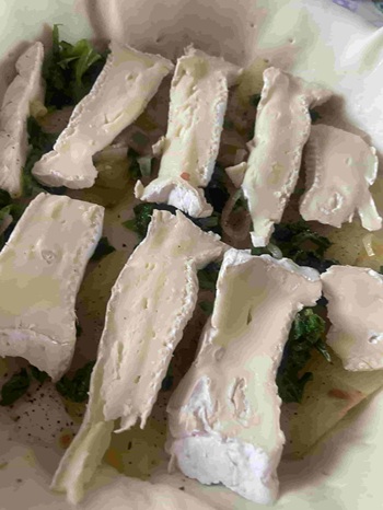 Adagiatevi sopra le fette dl Camembert e richiudete la pasta ben bene.