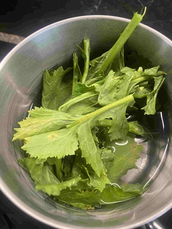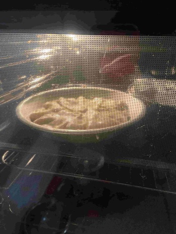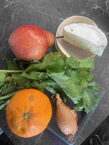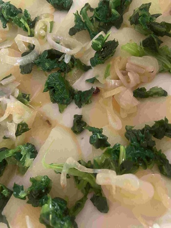soffritto di pere e arancio nella tortiera e cospargetevi sopra i friarielli lessati e ben strizzati.