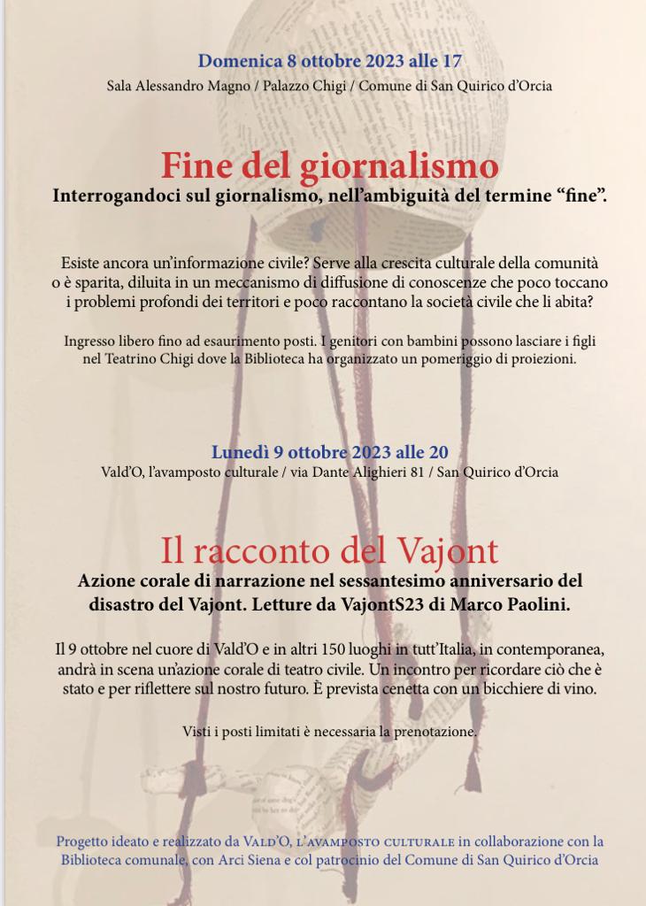 Un incontro - l’8 ottobre nella Sala Alessandro Magno del Comune di San Quirico d’Orcia (ore 17) - affronta questa discussione scomoda. L’idea è quella di parlare, e anche di ascoltare, tutti insieme, senza paure, le diverse esperienze, le testimonianze di chi continua a fare inchiesta e di chi cerca storie, fa cronaca, consuma le scarpe sulle strade del mondo per raccontare la realtà; di chi ha il sogno del giornalismo e di chi si batte perché sia un segmento importante della nostra democrazia.