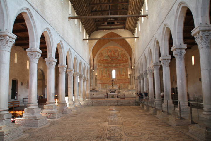 Vale assolutamente il viaggio, quanto meno per la pavimentazione musiva che risale all’epoca di Teodoro. Nessuna concisa descrizione renderebbe mai merito a quello che si può vedere entrando in quel luogo e alla adiacente "cripta degli scavi". Su tutta la pianura circostante svetta un campanile di 73 metri, innalzato nell' XI secolo.