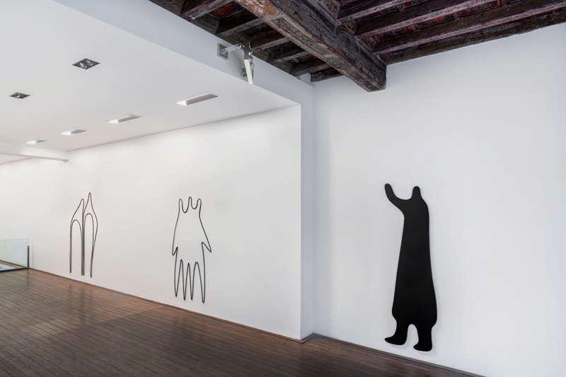 A Firenze, Nancă rivisita dunque una selezione di disegni d’archivio, trasformando queste figure in presenze scultoree a grandezza naturale. Come con i lavori mostrati ai Giardini, i suoi ibridi di disegno e scultura recuperano corpi anonimi dalla periferia del pensiero architettonico e li riposizionano come soggetti di riflessione artistica. Traendo ispirazione dall’uso della carta da lucido nella pratica architettonica tradizionale - o da quello che oggi potrebbe essere considerato un metodo arcaico - Nancă sovrappone queste figure a superfici traslucide, rimuovendole parzialmente dal loro contesto originale. In tali composizioni spettrali, l’artista assembla forme di realtà celesti come pianeti, stelle e frammenti di materia cosmica, aprendo uno spazio contemplativo in cui la presenza umana è ripensata all’interno di un vasto continuum universale. Nella visione di Nancă, queste sagome effimere declinano in una riflessione sulla condizione umana: le meditazioni diventano transitorie, stratificate e sospese tra l’immediatezza della vita quotidiana e il mistero del cosmo che si perpetua. Adsumus, latino per “We are here” rappresenta una silenziosa rivendicazione della propria presenza sulla Terra, considerata uno dei tanti pianeti possibili da abitare. Riecheggia lo sguardo speculativo della colonizzazione spaziale, pur basato su elementi familiari: le figure in scala distintive dei disegni architettonici del XX secolo, un tempo utilizzate per suggerire la presenza umana in ambienti progettati. Ripensate in un contesto cosmico, queste figure diventano indicatori "della nostra fragile ma persistente occupazione della superficie planetaria", scrive Vlad Nancă.