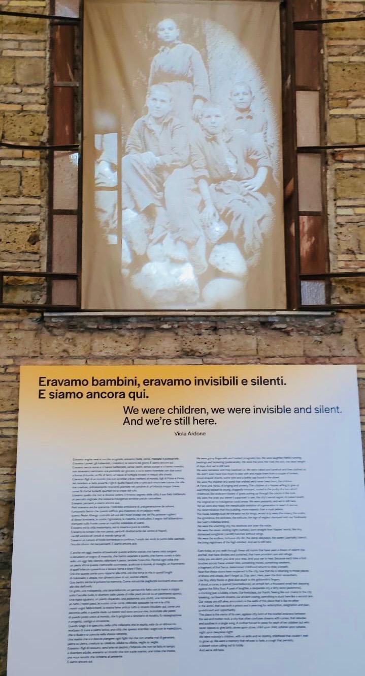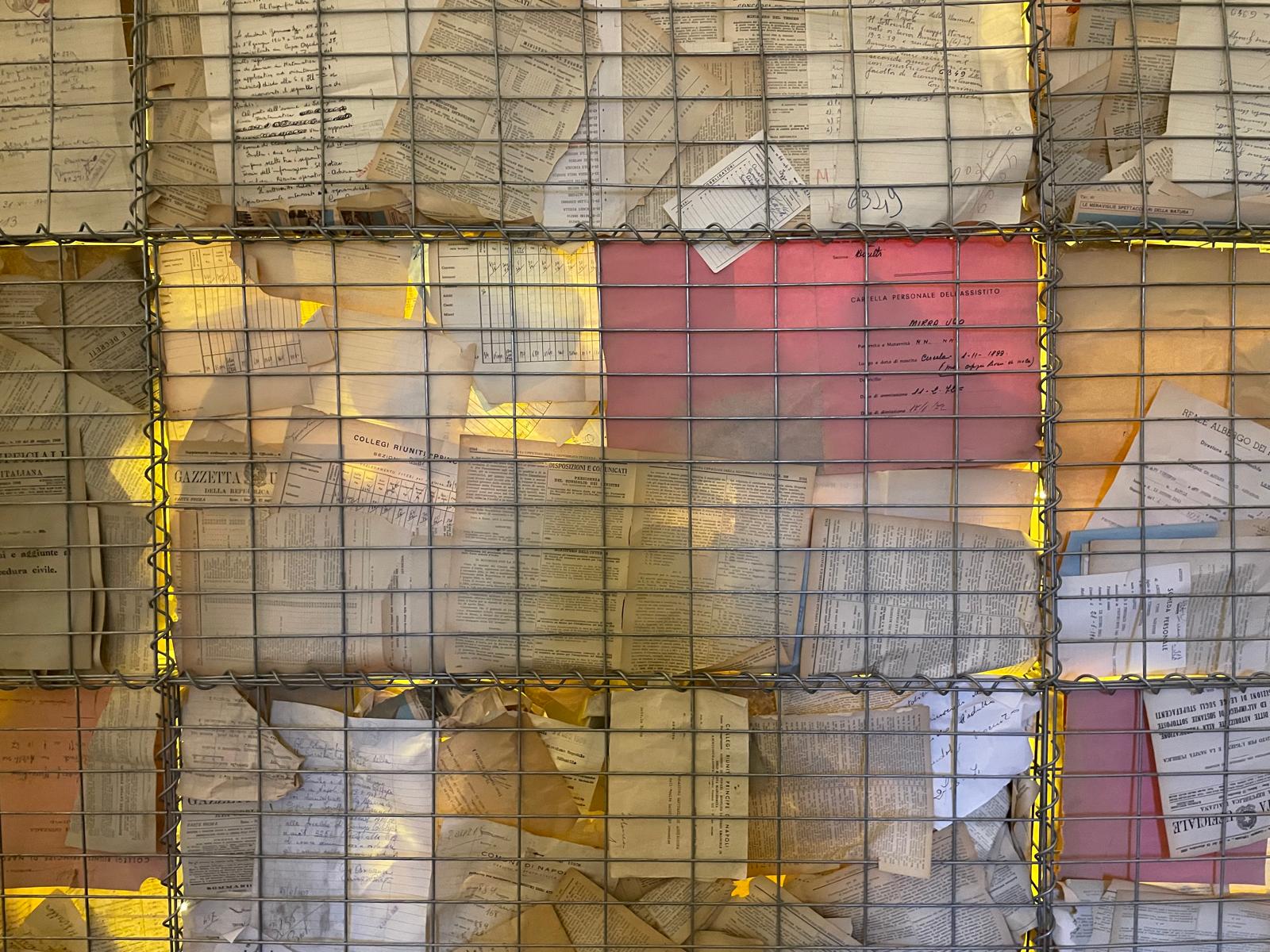 Le transenne che delimitano il corridoio che introduce al Refettorio sono tappezzate di fogli e documenti d’epoca e gli spazi del Refettorio stesso sono riempiti di parole, risate e filastrocche di bambini: voci conservate negli archivi sonori della prima metà del Novecento con cui il musicista e performer Massimo Cordovani ha realizzato una colonna sonora originale.
