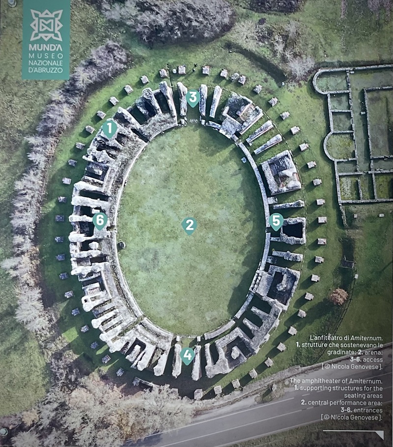 Il simbolo del sito è l'anfiteatro, dichiarato monumento nazionale nel 1902, costruito a cavallo della via Amiternina, in modo tale da essere notato da chiunque passasse e rimasto visibile nel corso dei secoli. Poteva accogliere fino a cinquemila persone. È stato riportato alla luce alla fine degli anni Sessanta.