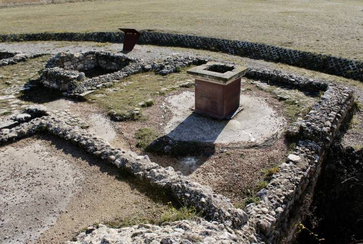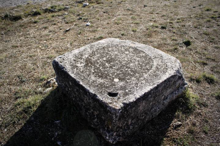 e un blocco monolitico venuto in luce nel settore sud-orientale del portico, a poca distanza dalla cisterna. La faccia superiore del monolite è leggermente concava, con incasso a forma di H, collegato attraverso un foro ad una piccola cavità circolare. Secondo gli studiosi, l'inclinazione del foro fa pensare che potesse essere utilizzato per estrarre e far scorrere del liquido, probabilmente oleoso, per uso cerimoniale.