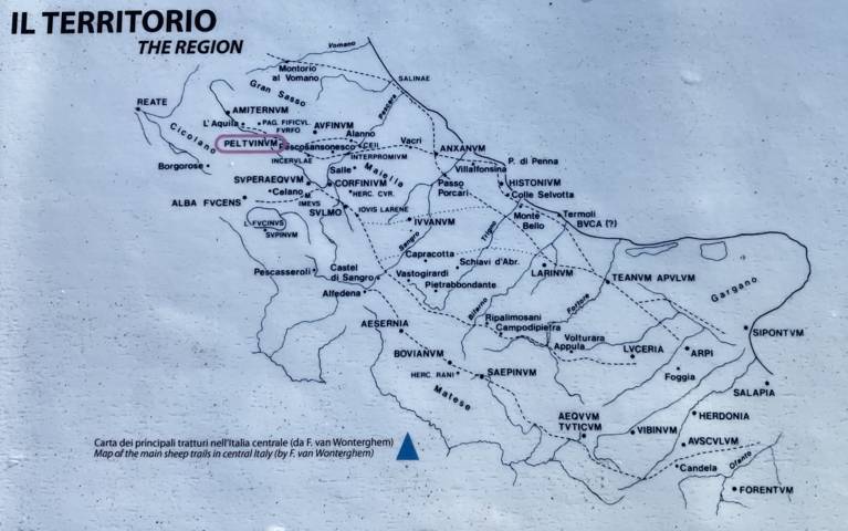 Peltuinum era attraversata da un antico tratturo, poi diventato la via Claudia Nova al tempo dell’imperatore Claudio: collegava due delle grandi arterie, la via Salaria e la via Tiburtina Valeria Claudia che da Roma portavano all'Adriatico.