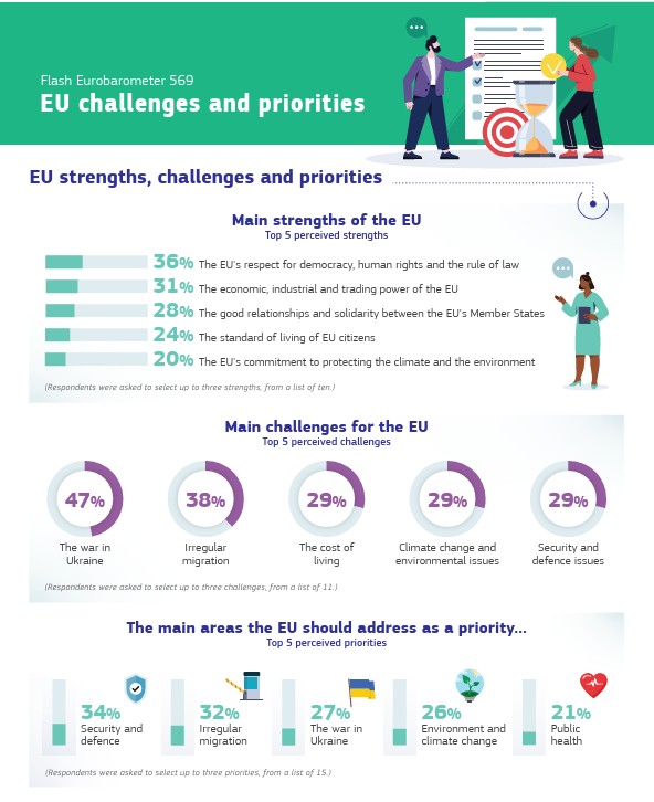La guerra in Ucraina, menzionata dal 47% degli europei partecipanti al sondaggio, rimane ancora la principale sfida che l'UE si trova ad affrontare. Alla domanda sulle sfide globali per il futuro dell'UE, i conflitti nel mondo sono la risposta più ricorrente (41%), seguita dalla migrazione irregolare (35%), dai cambiamenti climatici e dalle questioni ambientali (31%). La quarta sfida più menzionata è nuova e riguarda il rischio che l'UE perda il suo ruolo e la sua influenza nel mondo (30%).