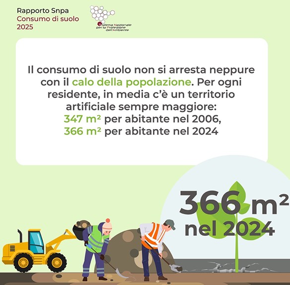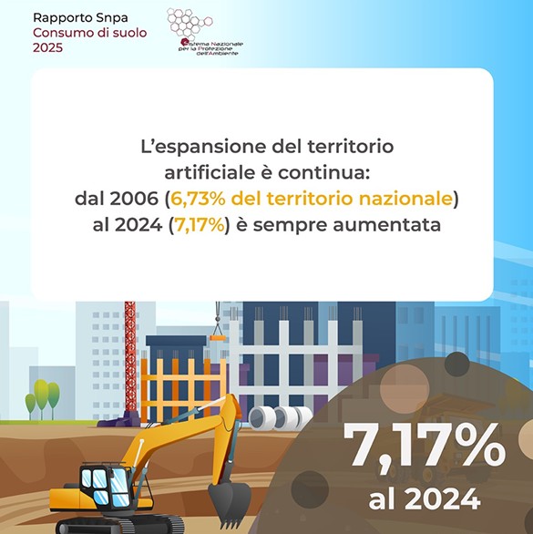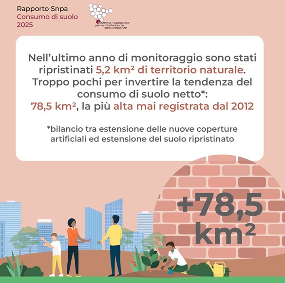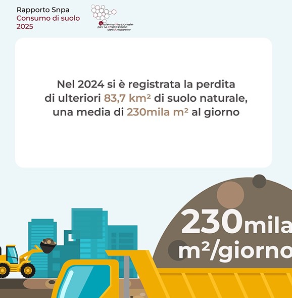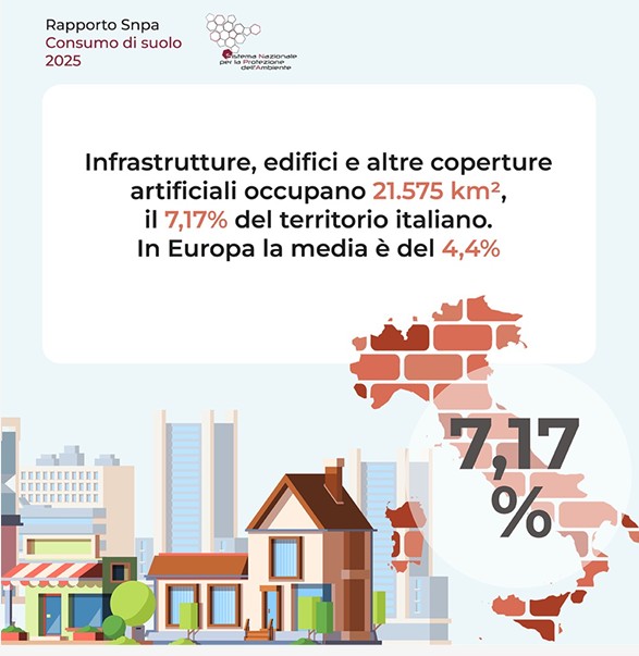 È stato presentato nei giorni scorsi a Roma il Rapporto 2025 dell’ISPRA su “Consumo di suolo, dinamiche territoriali e servizi ecosistemici”, accompagnato, come ogni anno da un EcoAtlante contenente mappe interattive e scaricabili che consentono di osservare le trasformazioni del territorio e personalizzare le informazioni in base alle esigenze. Il Presidente dell’ISPRA, Stefano Laporta, e la Direttrice generale dell’Istituto, Maria Siclari, nei loro saluti di apertura, hanno fatto notare come sia da considerarsi significativo che la presentazione del Rapporto sia avvenuta proprio il giorno successivo alla approvazione, in sede europea, della Direttiva che introduce un nuovo sistema di monitoraggio del suolo e della sua resilienza, norma che si affianca al Regolamento già in vigore sul ripristino della natura e sul monitoraggio degli ecosistemi urbani. Una direttiva, hanno ricordato i massimi esponenti dell’Istituto, che molto deve proprio all’esperienza dell’ISPRA e che da questa recupera l’obiettivo di verificare i processi di consumo irreversibile del suolo, figlio della sua impermeabilizzazione, e anche del consumo reversibile, legato in gran parte all’avanzamento di cantieri per le grandi opere infrastrutturali; ma anche alle coperture del terreno connesse alla installazione di campi fotovoltaici.